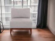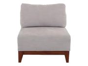 Moderno sillón sin brazos modular, con patas de madera, su estructura es de madera sólida, hule espuma de alta densidad y tapizado con tela color beige.